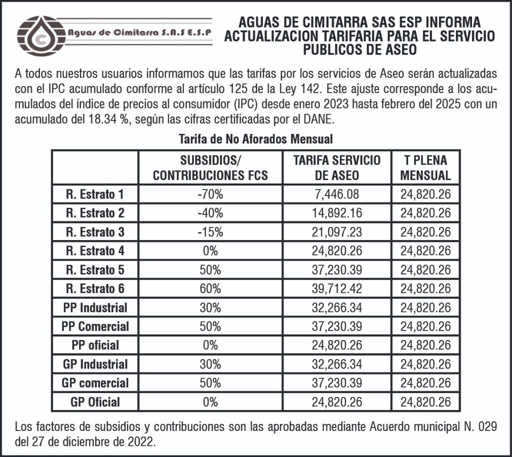 Por lo tanto para el año 2024 aguas de cimitarra prestadora de los servicios públicos domiciliarios de acueducto alcantarillado y aseo en la ciudad de cimitarra, aplicarán los siguientes factores de subsidio a las tarifas en el periodo 2024 y siguientes, de conformidad con lo establecido en la ley 142 de1994, la ley 632 de 2000, ley 1450 de 2011 y sus decretos reglamentarios.